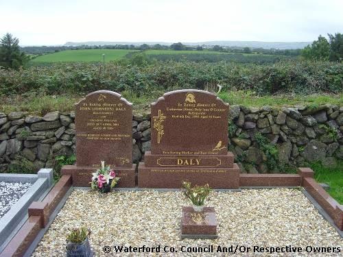 Garranbane Graveyard Co. Waterford. John (Johneen) Daly. Ballymarket: and Croydon England: Died 20th April 2004 Aged 48 yrs; Loving husband father and brother: Forever in our hearts: Rest in peace; Loving ??? James (2) Catherine (Kitty) Daly "née O'Connor." Ballymarket: Died 6th Dec. 1998 Aged 72 Years: To a Loving Mother and Best Friend: Daly: Erected by her loving husband Thomas and Family