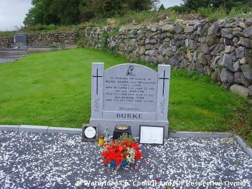 Garranbane Graveyard Co. Waterford. Mary Burke (nee McGrath). Clonea Upper: Died 11th April 1992 aged 72 yrs; Her son Martin. Died 31st Jan. 1993 aged 30 yrs; Her husband Tom. Died 6th Oct. 1993 aged 76 yrs