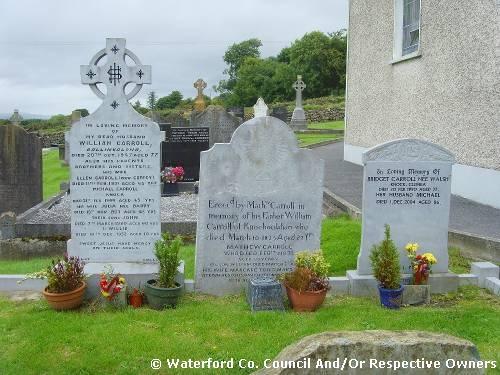 Garranbane Graveyard Co. Waterford. William Carroll. Ballinvalona: Died 20th Oct. 1947 aged 77; Also his parents: Brothers and sisters: His wife Ellen Carroll (née Coffey). Died 11th Feb. 1951 aged 65 yrs: Michael Carroll. Knock: Died 21st Feb. 1944 aged 65 yrs; His wife Julia née Barry. Died 15th Nov. 1927 aged 45 yrs; Their sons John. Died 7th March 1980 aged 60 yrs; And Willie. Died 10th Dec. 1932 aged 10