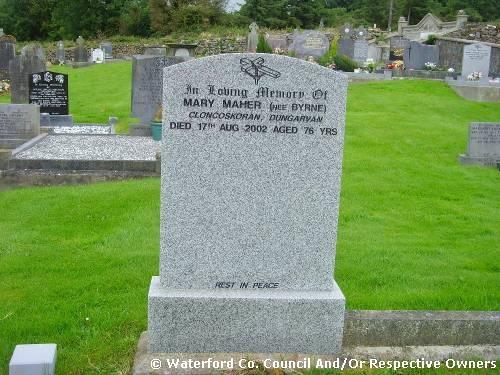 Garranbane Graveyard Co. Waterford. Mary Maher (née Byrne). Cloncoskoran (Dungarvan): Died 17th Aug. 2002 aged 76 yrs