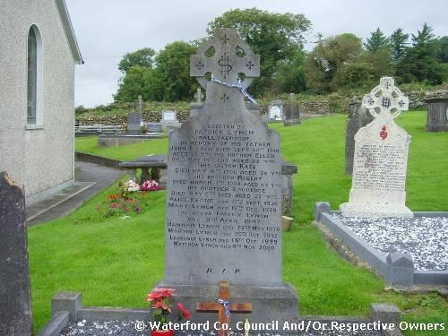 Garranbane Graveyard Co. Waterford. Patrick Lynch. Ballykerogue; In memory of his father: John Lynch. died Sept. 30th 1910 Aged 82 yrs; his mother Ellen. Died May 19th 1913 aged 82 yrs; His sister Kate. Died 4th May 1900 aged 38 yrs; His brother Robert. Died March 7th 1904 aged 43 yrs; His brother Laurence. Died May 6th 1923 aged 52 years; Alice Keane. died 17th Sept. 1936; Mary Lynch. died 18th Dec. 1939; The above Patrick Lynch. Died 9th April 1947; Hannah Lynch. died 25th May 1950; Martin Lynch. died 26th Oct. 1952; Laurence Lynch. died 16th Oct. 1999; Matthew Lynch. died 6th Nov. 2000