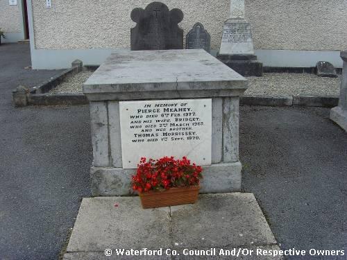Garranbane Graveyard Co. Waterford. In memory of Pierce Meaney. Who died 6th Feb. 1977: And his wife Bridget; Who died 2nd March 1965; And her brother Thomas Morrissey