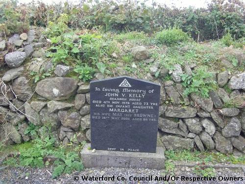 Garranbane Graveyard Co. Waterford. John V. Kelly. Shandon House: Died 4th Nov. 1978 aged 73 yrs; Also his infant daughter: Margaret; His wife May (née Browne) Died 28th May 2002 aged 86 yrs