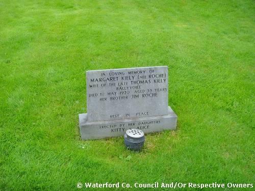 Garranbane Graveyard Co. Waterford. Margaret Kiely (née Roche). Wife of the late Thomas Kiely. Ballyvoile: Died 1st May 1920 aged 33 years; Her brother Jim Roche. Rest in peace: Erected by her daughters; Kitty and Alice