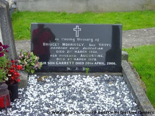 Garranbane Graveyard Co. Waterford. Bridget Morrissey (née Troy). Harbour View Dungarvan: Died 21st March 1938; Her husband Augustine. Died 5th March 1978; Their son Garrett died 20th April 2006