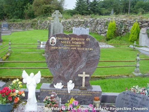 Garranbane Graveyard Co. Waterford. Tombstone of Nigel Norris. Englishtown: Died 26th Sept. 1999 aged 18 yrs: Rest in peace. Erected by his loving parents Martin and Irene; Sister Aisling and brother Michael