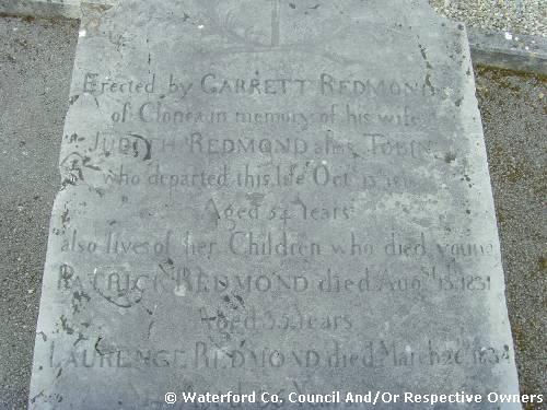 Garranbane Graveyard Co. Waterford. Erected by Garrett Redmond. of Clonea in memory of his wife; Judith Redmond alias Tobin. who departed this life Oct. 13th 1818 Aged 54 years; also lives of her Children who died young Patrick Redmond. died Aug. 13th 1831; Aged 35 years; Laurence Redmond. died March 26th 1834