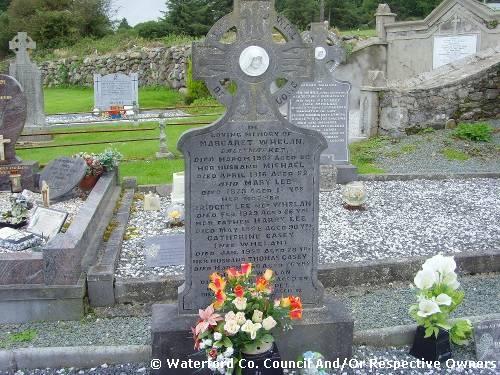 Garranbane Graveyard Co. Waterford. Tombstone of Margaret Whelan. Ballymarket. Died March 1907 aged 60; Her husband Michael. Died April 1916 aged 82; And Mary Lee. Died 1923 aged 17 yrs; Her mother Bridget Lee née Whelan. Died Feb. 1929 aged 56 yrs; Her father Harry Lee. Died May 1946 aged 90 years; Catherine Casey (née Whelan). Died Jan. 1955 aged 78 years; Her husband Thomas Casey. Died March 1960 aged 76 years
