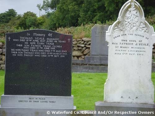 Garranbane Gravestone Co. Waterford. Tombstone of Tombstone of Michael Veale. Kilmaloo: Who died 19th April 1847 aged 46 years; His wife Ellen Veale; Their son Patrick Veale. Clonea Who died 10th June 1918; His wife Nano Veale who died 7th Aug. 1945; Their son Thomas who died 23rd March 1955; His wife Bridget who died 19th Sept. 1991. (2) Tombstone of Rev. Patrick J. Veale. St. Mary's Horwich Bolton Lancashire [England]. Died 6th Oct. 1966