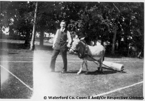 County Tipperary. A view of Thomas Stokes leading a donkey. A roller is harnessed to the donkey. Grass which is marked out for tennis is being rolled |