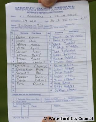 County Waterford. Referee John O'Brien's report and match card for De La salle and Crusaders |
